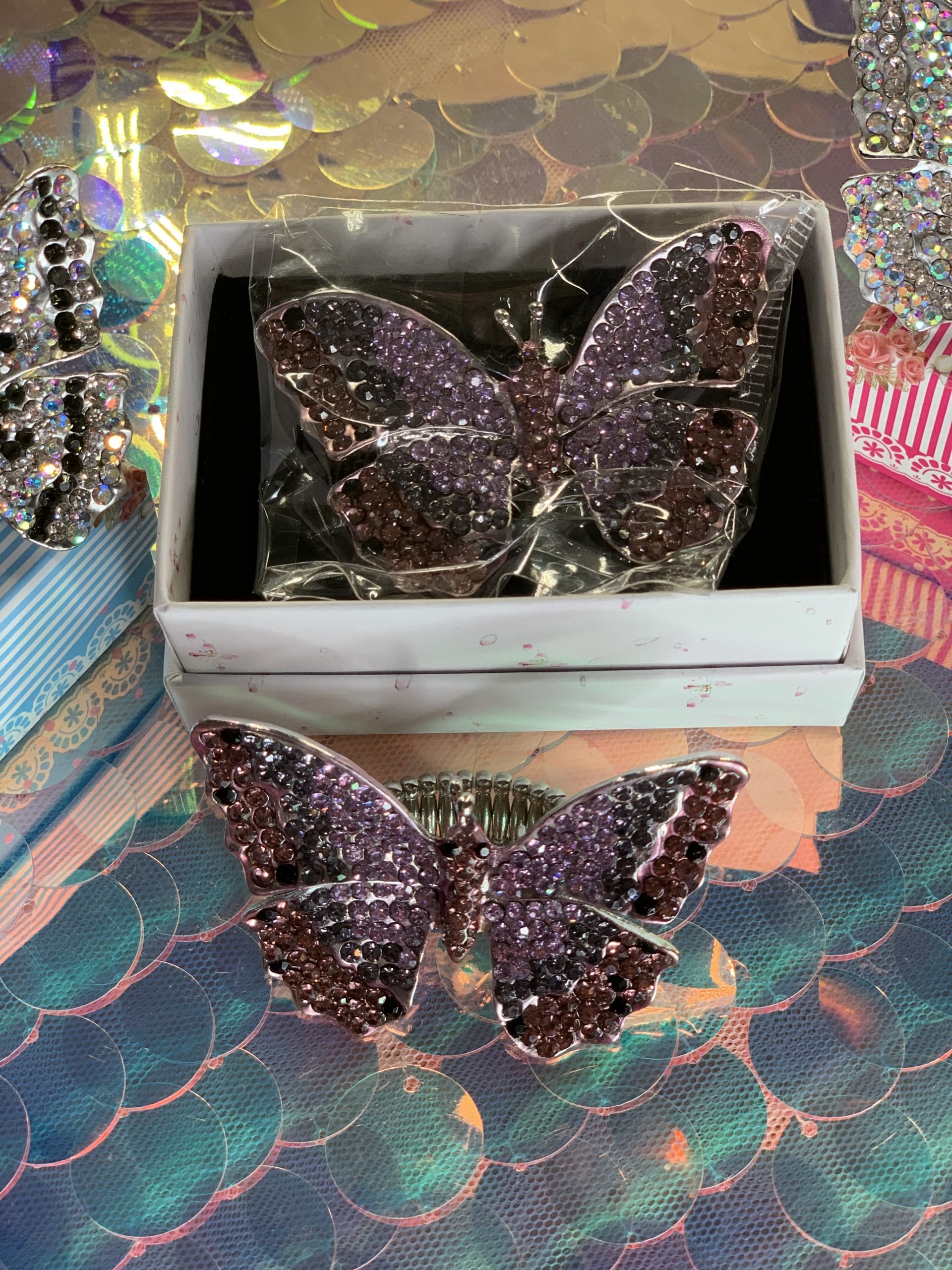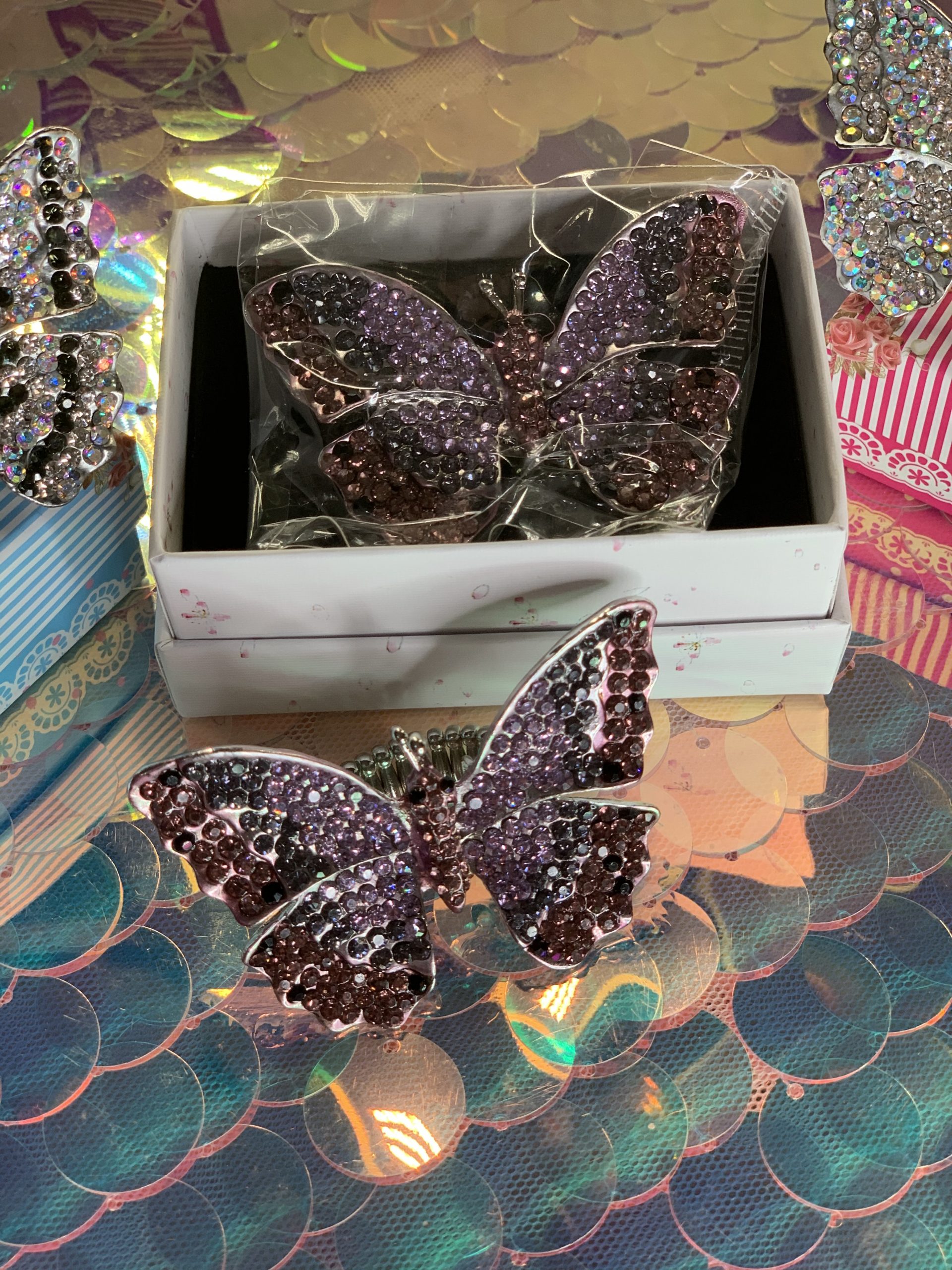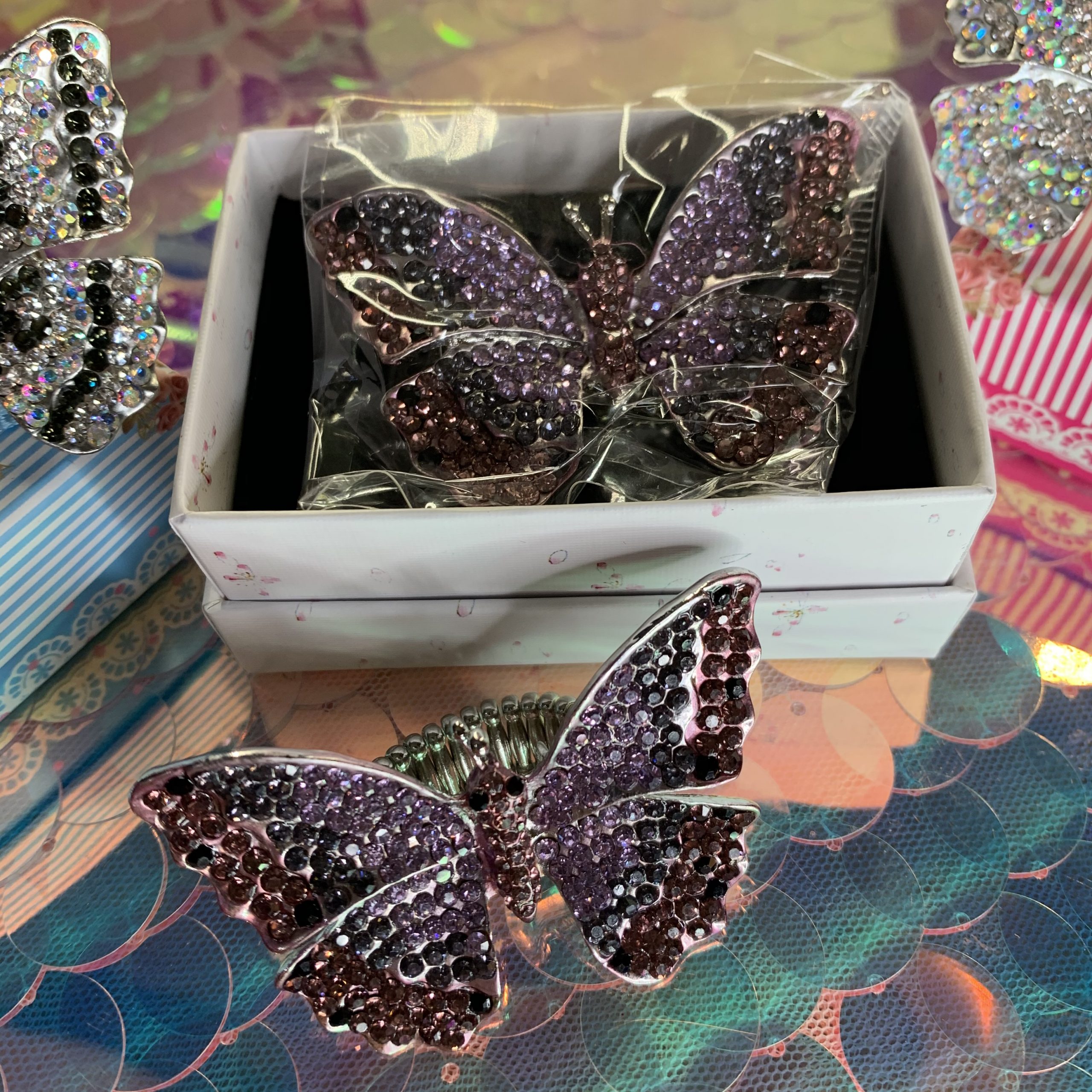 LAVENDER, PURPLE AND ROSE PINK Rhinestone Crystal Adjustable Stretch Butterfly Ring